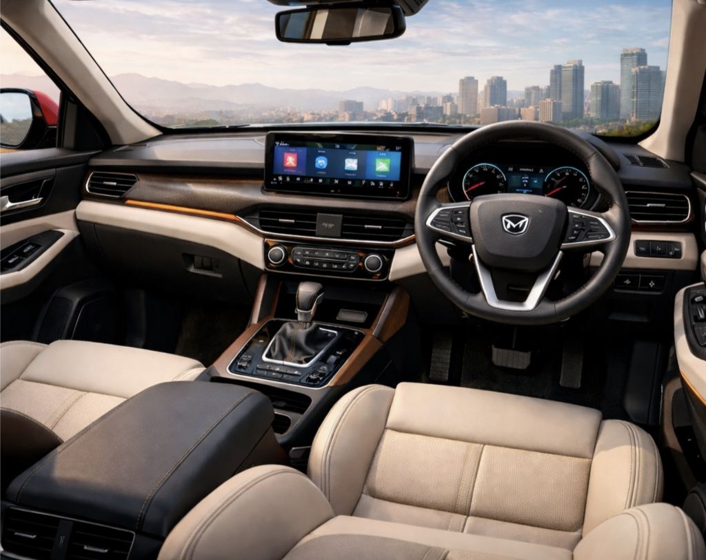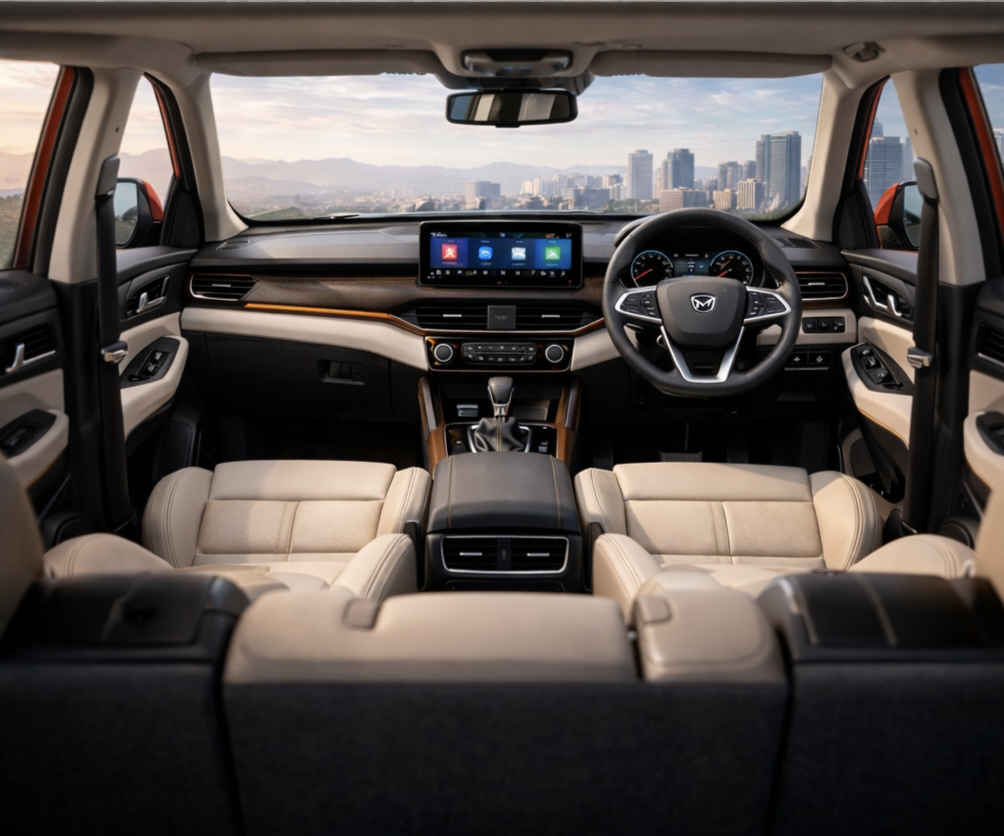 Step inside the Mahindra Xyron, and you can expect a premium, tech-loaded cabin. The interior is designed to provide maximum comfort for both the driver and passengers. A dual-tone dashboard, soft-touch materials, and ambient lighting may give it a luxury feel.