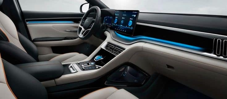 The fully digital instrument cluster provides all essential driving information in a clear and customizable format. It shows speed, battery status, range, navigation prompts, and driver assistance alerts.